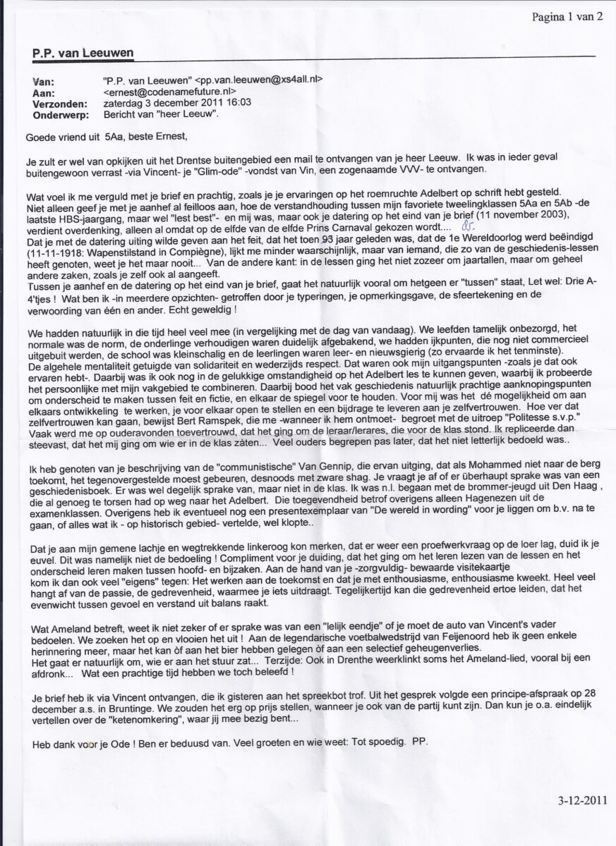 Maar toen ik onlangs na 30 jaar naar een reünie vertrok en nu óp de Rijksstraatweg reed, toen voelde ik de sterke hoop dat u er ook zou zijn. En daar stond u: een beetje scheef met veel te grote handen en nu een nog meer wegtrekkend linkeroog.